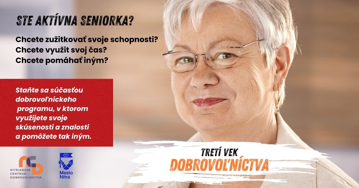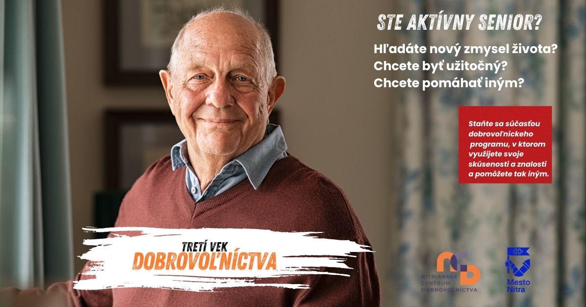V októbri 2023 sme v spolupráci s piatimi organizáciami spustili dlhodobé dobrovoľnícke programy pre seniorov v meste Nitra. V roku 2024 sme boli úspešní v hľadaní ďalších zaujímavých organizácií, ktoré sa pridajú do tohto dobrovoľníckeho programu pre seniorov. Od novembra 2024 funguje program Tretí vek dobrovoľníctva fungovať aj v Materskom centre Klokanček, v Krajskom osvetovom stredisku v Nitre, v Centre pre rodinu Nitra a v ZSS Kreatív Klasov.